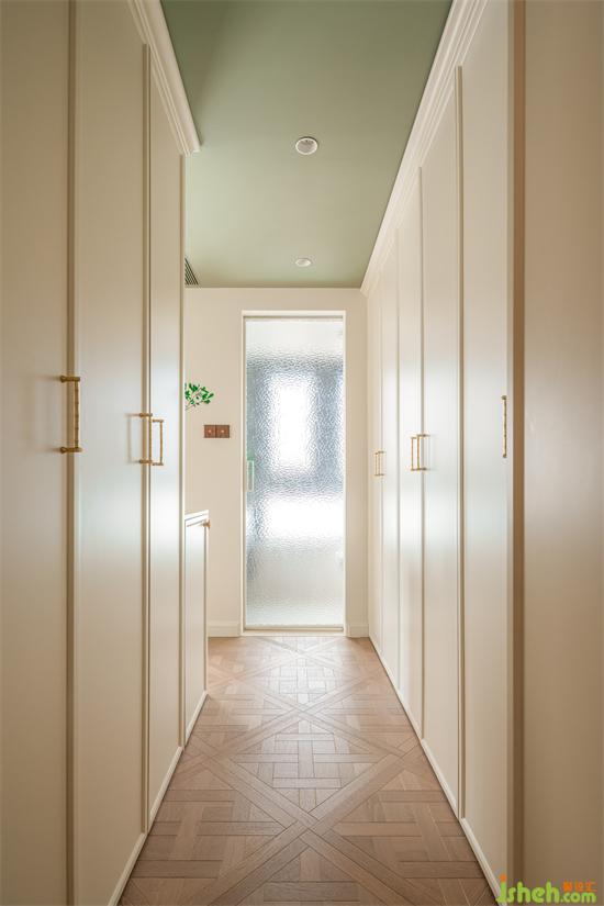 主衛(wèi)推門采用水波紋玻璃,自帶復(fù)古氛圍感,干凈清爽也易打理,海納公館家裝設(shè)計(jì)即使在房門打開過道對著公共空間的時(shí)候也能帶來油畫般的視覺感受。