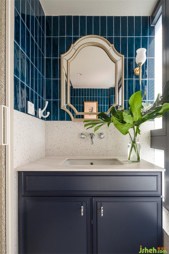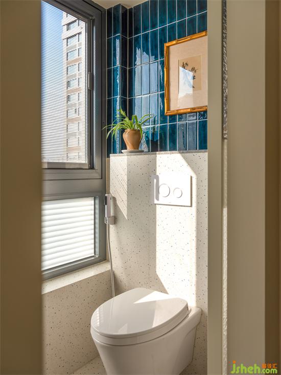 藍(lán)色系花磚與水磨石鋪陳的主衛(wèi)空間濃郁又清爽,兩分離布置實(shí)現(xiàn)日常的簡潔高效。