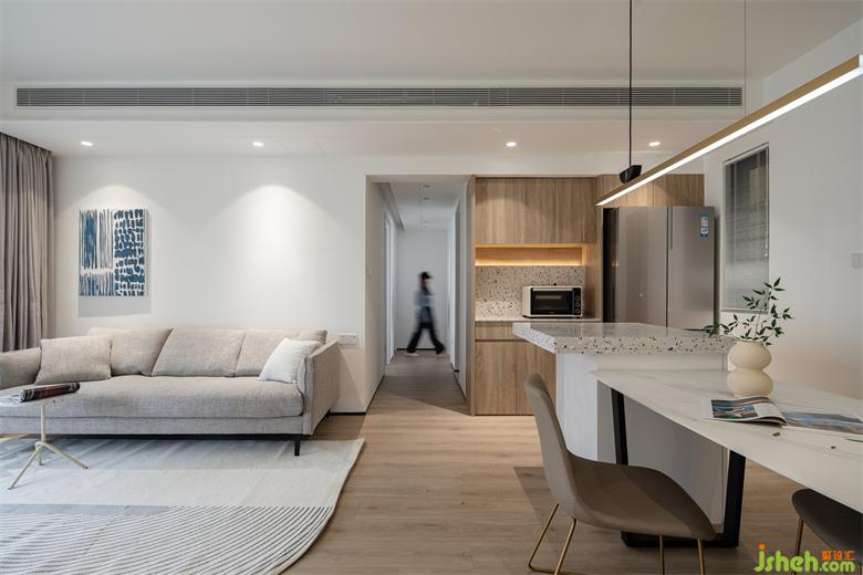 客廳空間的布置重點在于色彩以及布品的搭配,簡潔的白由吊頂延伸至沙發(fā)背景連接過道餐廳,中性色的包容也讓空間連貫整體同時無限擴展了空間尺度,呈現(xiàn)舒適療愈的居家氛圍。