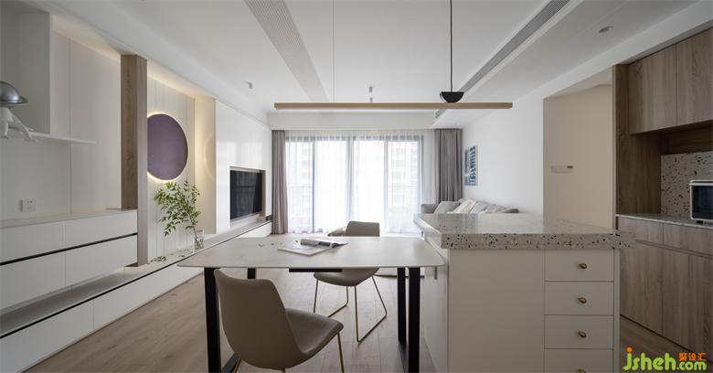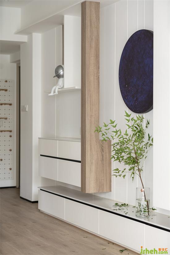 客廳與玄關(guān)的連接也由延伸的白色收納背景相連接。5米多的電視背景兼具收納的實用功能與結(jié)構(gòu)均衡的形式美學享受。