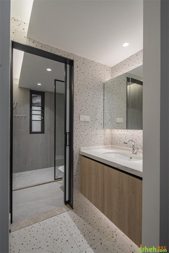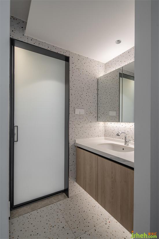 公衛(wèi)做了干濕分離,深圳豪峰園家裝設(shè)計(jì)以超白長虹波移門做分隔,靠過道的干區(qū)用與餐廳同花色的水磨石鋪貼墻地面。