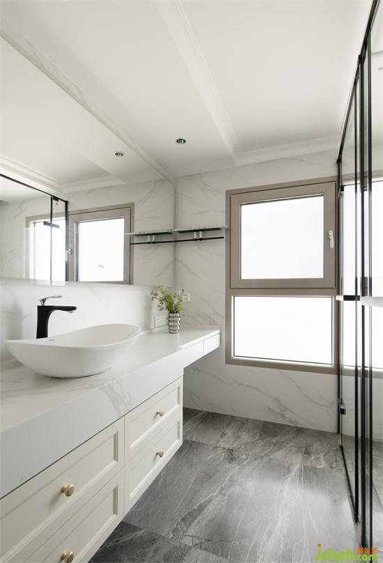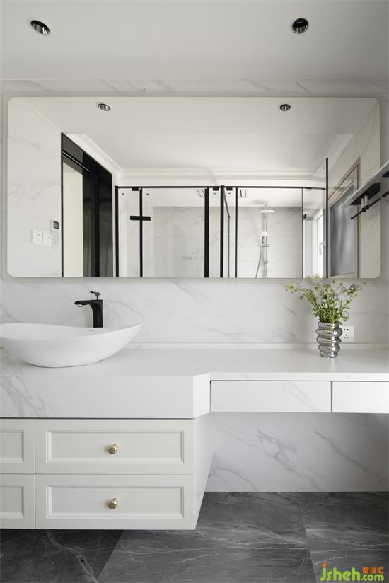 把洗漱和裝扮動(dòng)線整合,南山蘭溪谷家裝設(shè)計(jì)梳妝區(qū)域設(shè)置在衛(wèi)生間,與洗手臺(tái)相連。