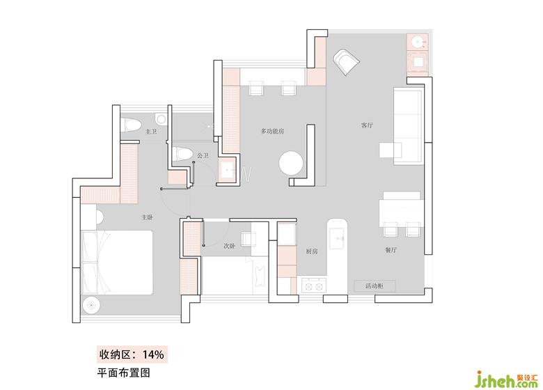 3.考慮主臥衣物的收納功能,取消主衛(wèi)的淋浴空間給到衣柜,門后向公衛(wèi)也借位收納一組,公衛(wèi)則借位書房作干區(qū),各空間的收納和功能分配得以最優(yōu)化。
