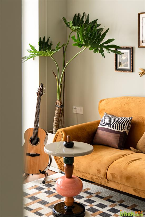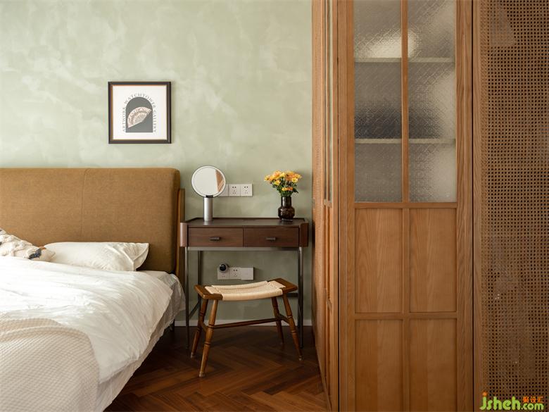 臥室床頭背景墻涂刷淺綠色天鵝絨藝術漆,棲游家園家裝設計以清新色塊糅合空間沉穩(wěn)內斂地古著肌理,呈現(xiàn)時尚與懷舊的藝術氛圍。