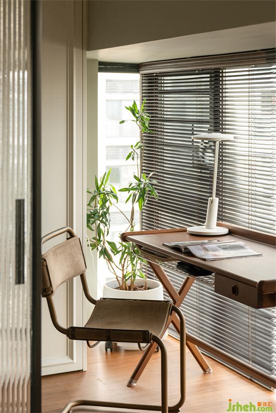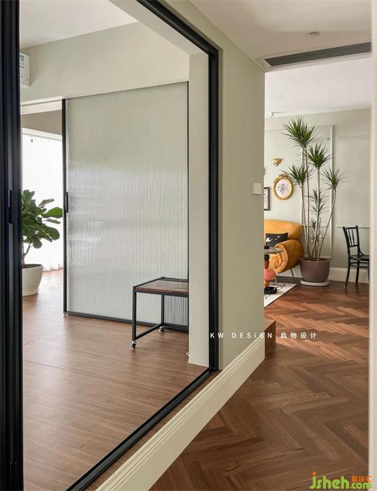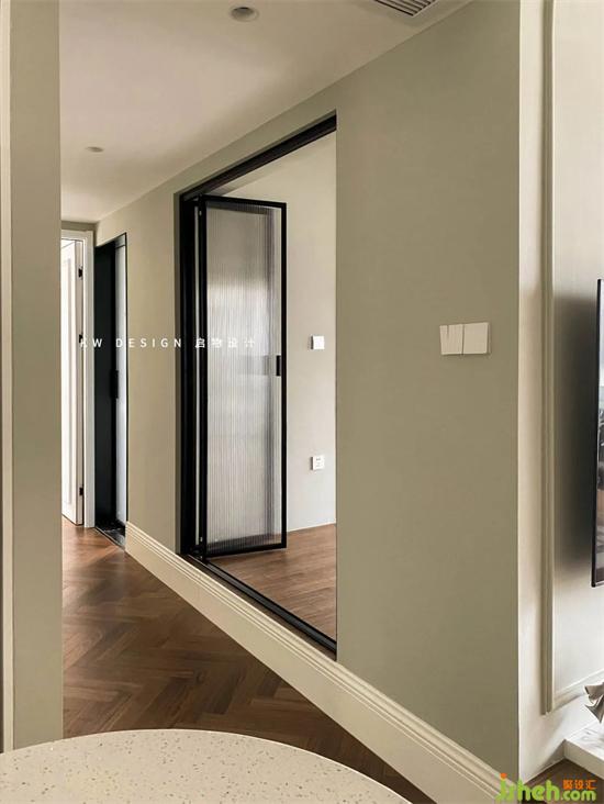 考慮收納區(qū)在過道盡頭,需要兼具美觀效果,海棠玻璃的夢幻朦朧裝點功能展示柜做流動端景。