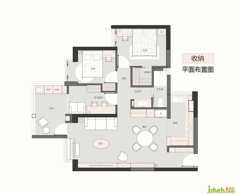 1.原格局過道偏空間右側(cè)壓縮了餐廳、衛(wèi)生間以及主臥空間,縮短沙發(fā)背景之后,使通往臥室的過道處在空間中軸線上,同時釋放有輕食臺的餐廳、三分離衛(wèi)生間、帶衣帽間的主臥、可三面下床有獨立書桌和收納的次臥,以及靈活的多功能房。