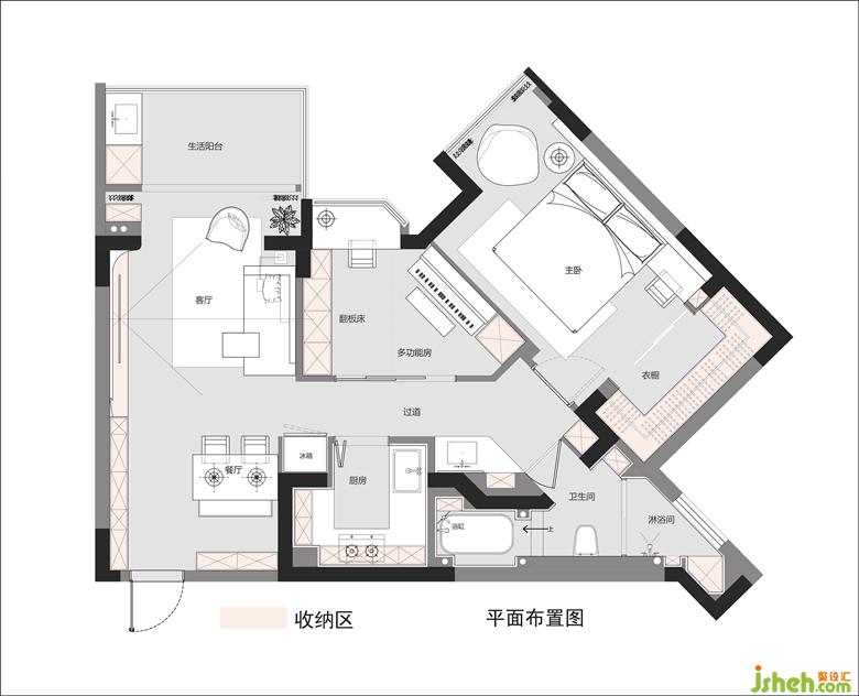 2. 次臥做多功能房兼臨時(shí)客房,控制尺度縮減開(kāi)間,拓寬了過(guò)道以放下冰箱位置,方便客餐廳以及廚房不同空間對(duì)冰箱的使用動(dòng)線。