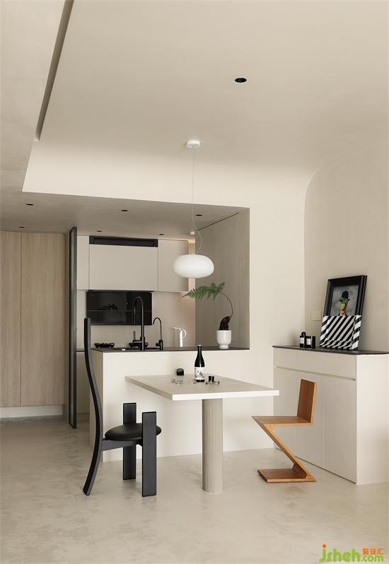 定制懸挑餐桌連接兼洗滌與備餐的水吧臺(tái),搭配餐邊收納豐富用餐形式。