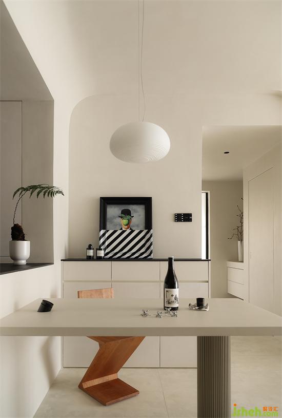 之于Magritte超現(xiàn)實(shí)畫(huà)像《人類(lèi)之子》進(jìn)行二次創(chuàng)作的手工掛畫(huà),賦予現(xiàn)代餐廚空間詩(shī)意的神秘和純粹魅力。