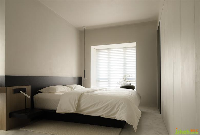打通的臥室長(zhǎng)達(dá)5米多的進(jìn)深,藉由木材與石材的穿插銜接,過(guò)渡辦公閱讀區(qū)和睡眠區(qū),床尾預(yù)留一整排收納衣柜。