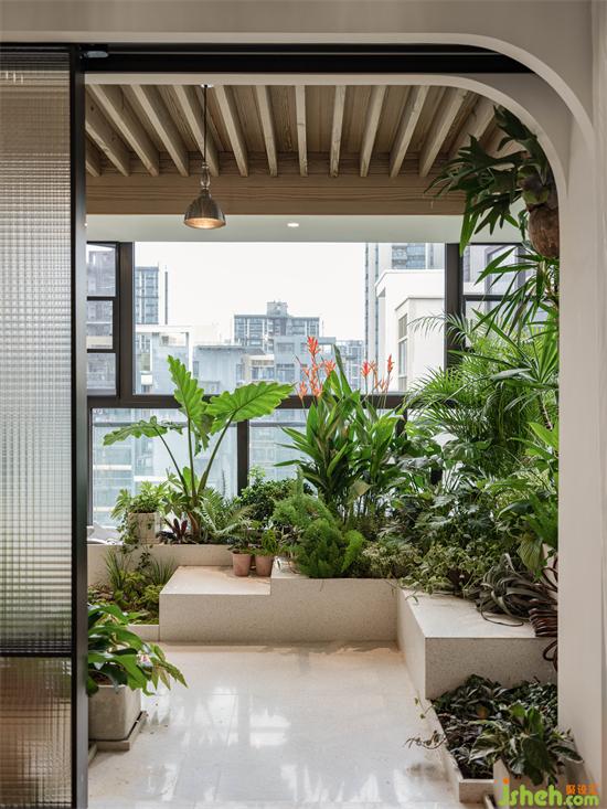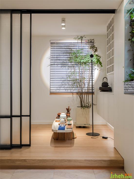 家裝設(shè)計(jì)由落日燈與綠植投射在百葉上虛實(shí)相間的光影效果營(yíng)造“前庭”的靜謐清致氛圍。在鬧市得一凈地,拾級(jí)而上,席地而坐,品茶道高闊論,如此閑情逸致令人艷羨。