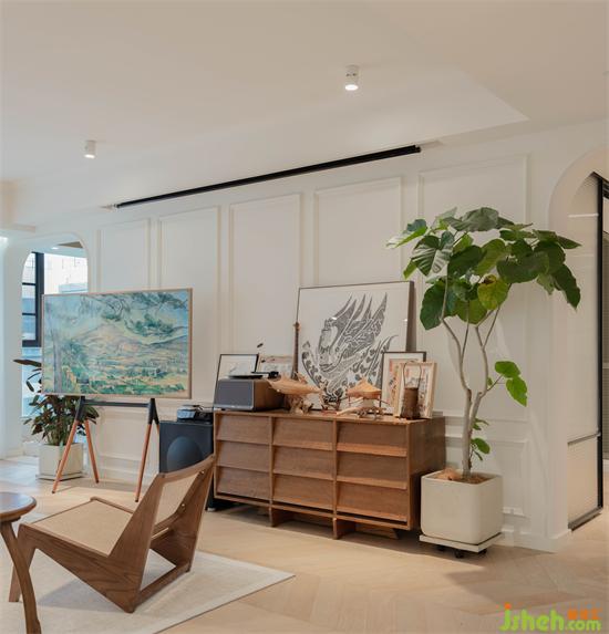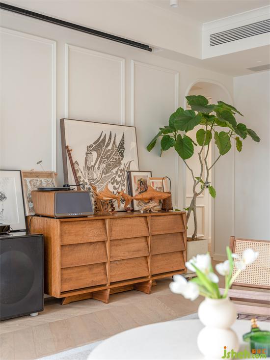 作為公領(lǐng)域的視覺(jué)中心,電視墻需要兼具實(shí)用與藝術(shù)美觀效果氛圍。配合各種工藝品和紀(jì)念品的陳列,選擇了一款古樸有設(shè)計(jì)感的斗柜作收納展示,搭配提升空間藝術(shù)氛圍的畫(huà)境電視和完善的聲響設(shè)備及投影實(shí)現(xiàn)視聽(tīng)享受。