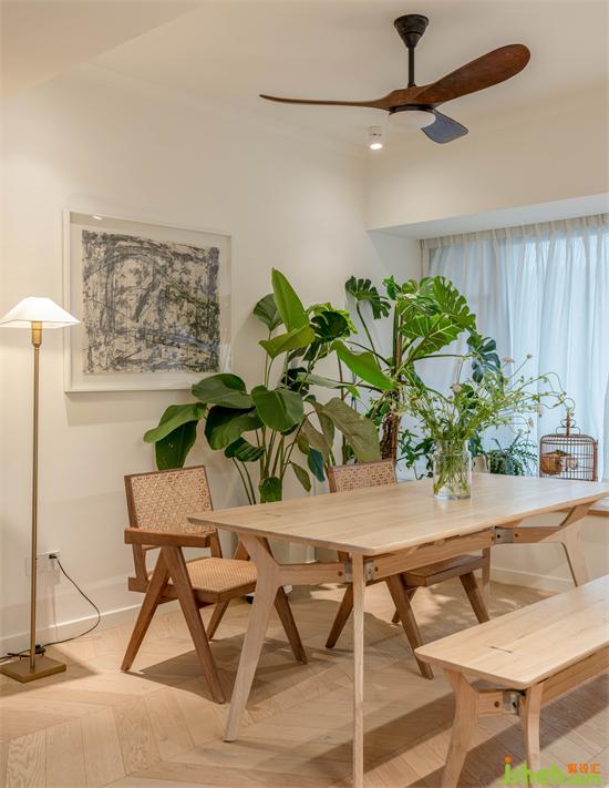 隨意的布置和個(gè)性單品營(yíng)造不被定義和固化的空間,1.8m的大餐桌搭配條凳和昌迪加爾的咖啡椅,為用餐空間增添休閑氣息和意境,方便友人到訪聚餐圍坐暢聊,日常Germany和先生也會(huì)一起在這里完成快捷高效的簡(jiǎn)餐和辦公。