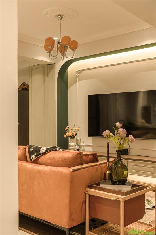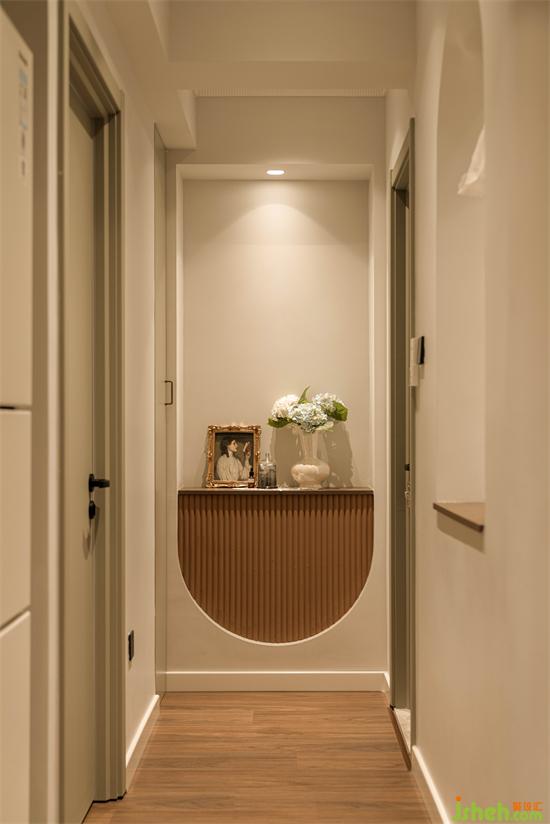 過(guò)道盡頭在倒置的拱門造型里嵌入焦糖色格柵面,擺上琳瑯滿目的物件和花卉,又是一處美的端景。怡楓園家裝設(shè)計(jì)兼具美觀的同時(shí)左邊還內(nèi)嵌了一組收納柜做日常儲(chǔ)物。