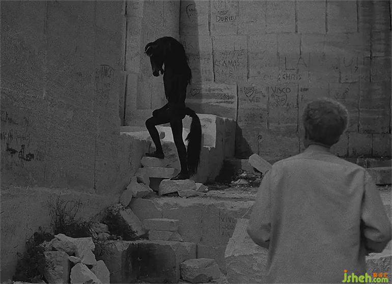 “黑色馬頭男子從臺階走下,進入光影采石場,他的影子投射在白色墻壁上。”