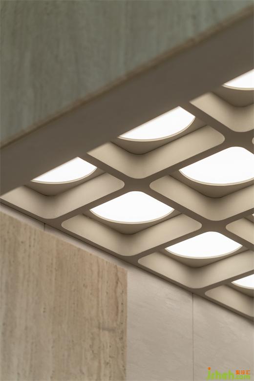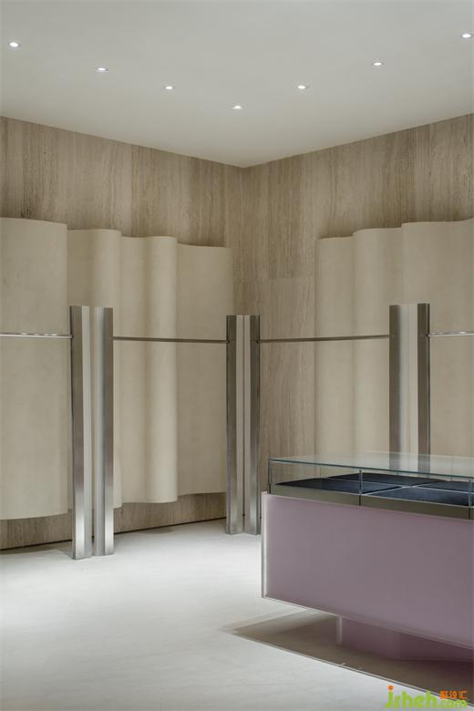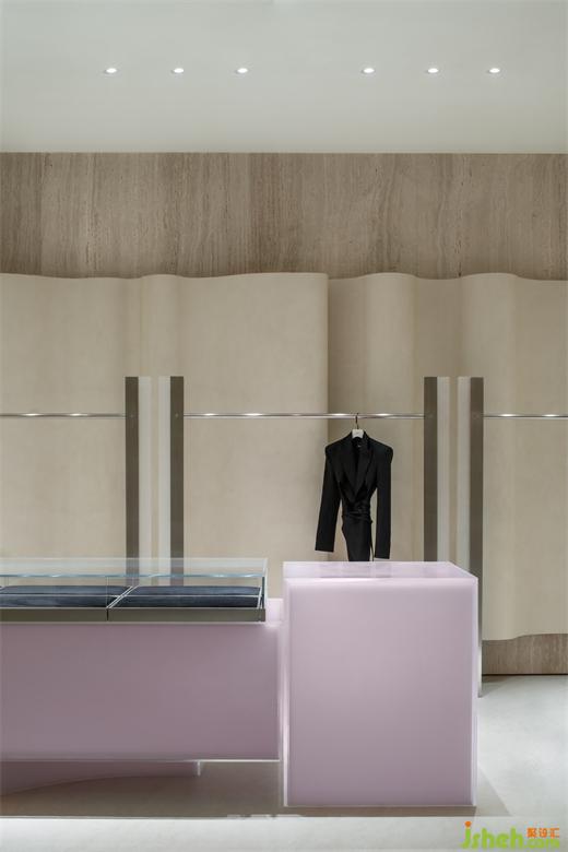 與試衣間一樣延續(xù)空間統(tǒng)一的設(shè)計(jì)手法,展廳設(shè)計(jì)通過(guò)材質(zhì)與光線的結(jié)合,為客人的試衣環(huán)節(jié)提供了舒適的場(chǎng)所,又能全面展示人與服裝的相襯。