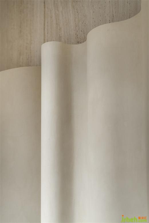 隨旋轉(zhuǎn)階梯順延而下,做舊的藝術(shù)墻體隨之大面積引入眼簾,展廳設(shè)計(jì)在這些仿若已歷經(jīng)百年、蘊(yùn)含時(shí)間與歷史痕跡墻面的環(huán)繞下,使得進(jìn)入者在感官層級(jí)與二層空間實(shí)現(xiàn)了連接與延續(xù)。