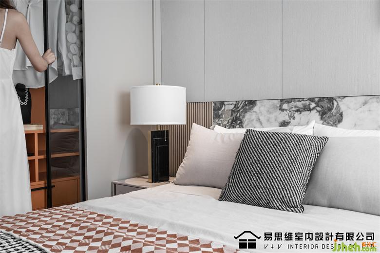 空間利用現下流行的墻面造型將視覺的注意力轉移在具有豐富圖案的石材紋理上,肌理表達出硬朗和干練的視覺,佛山家裝設計配合灰色調的床品、飄窗墊,傳達出穩(wěn)定安靜的情緒。