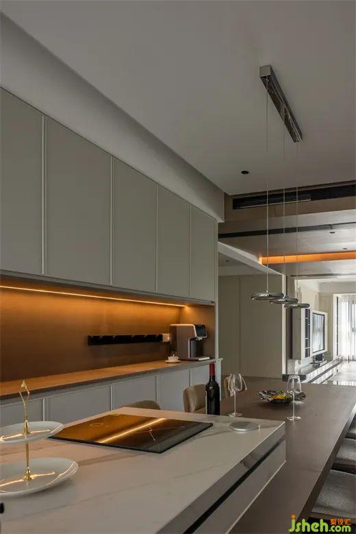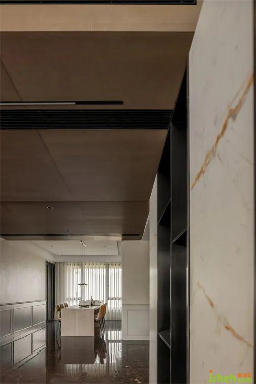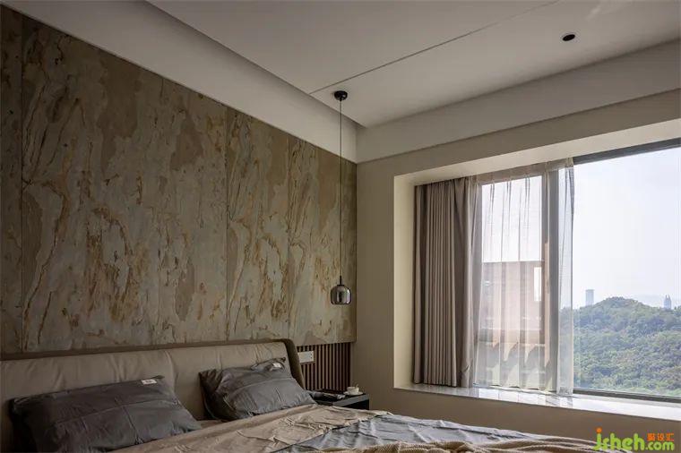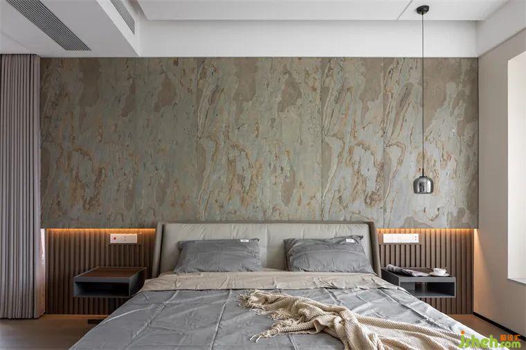 此外,臥室區(qū)域我們選用了一整面的巖板裝飾,搭配銀色金屬吊燈,既保持了臥室舒適溫馨的氛圍感,又點亮了臥室的整體風格,簡約而不失綺華,質(zhì)樸又不失精致。