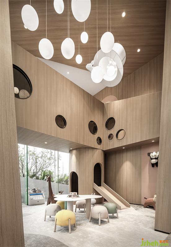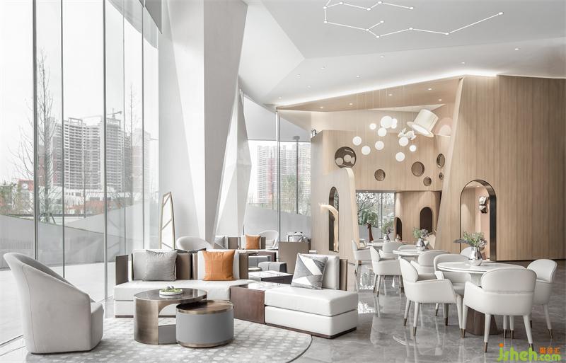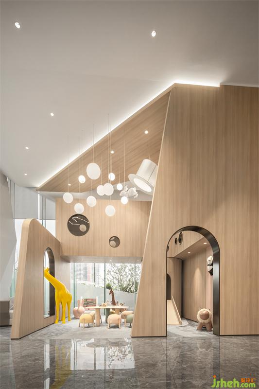 兒童區(qū)造了一所半開半閉的小房子,讓序列呈現(xiàn)的幾何體門洞充盈視覺畫面,積木游戲的場景思維試圖打破檔次與階層的障礙。故事基調(diào)是:售樓處設(shè)計找尋星河深處的那片愛麗絲夢游仙境,以魔幻為主題,懸掛在空中的魔法師禮帽突然有了魔法,兔子和夢幻氣泡鉆出營造奇幻世界,帶給人們感官驚喜。