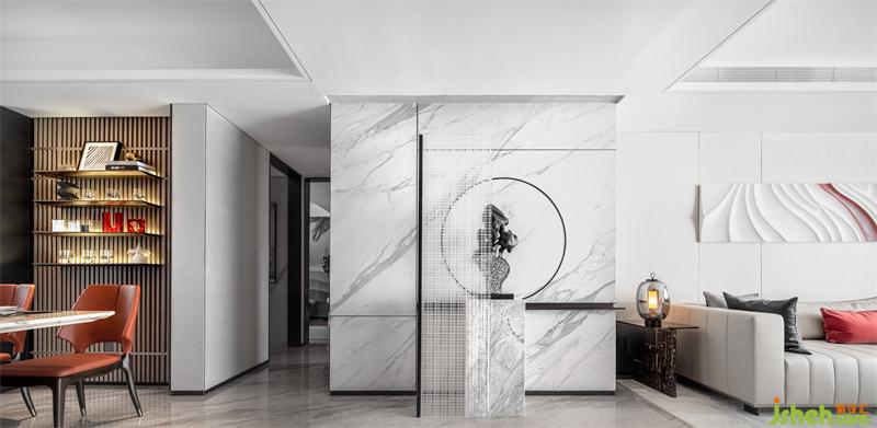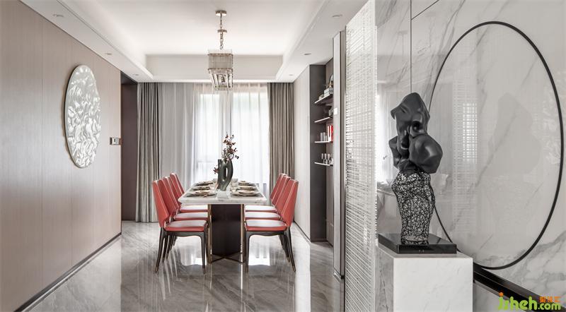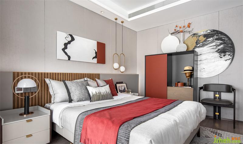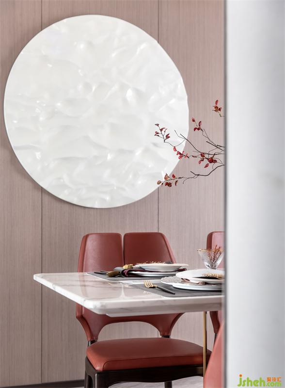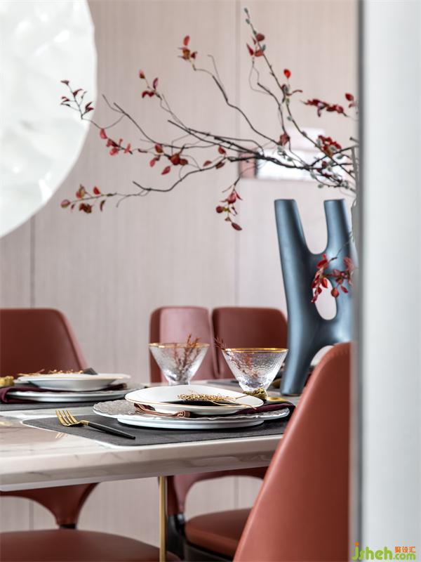 客餐廳、玄關(guān)及陽(yáng)臺(tái)“四合一空間”一體化的開(kāi)放式空間規(guī)劃穩(wěn)定又靈動(dòng)。樣板房設(shè)計(jì)蒼紅一抹,香生皋澤。視線所及之處,用胭紅喚醒視覺(jué)生機(jī),暖灰為景,亮色點(diǎn)睛,又現(xiàn)東方之美,濃淡相宜之間給居者眼前一抹驚喜。