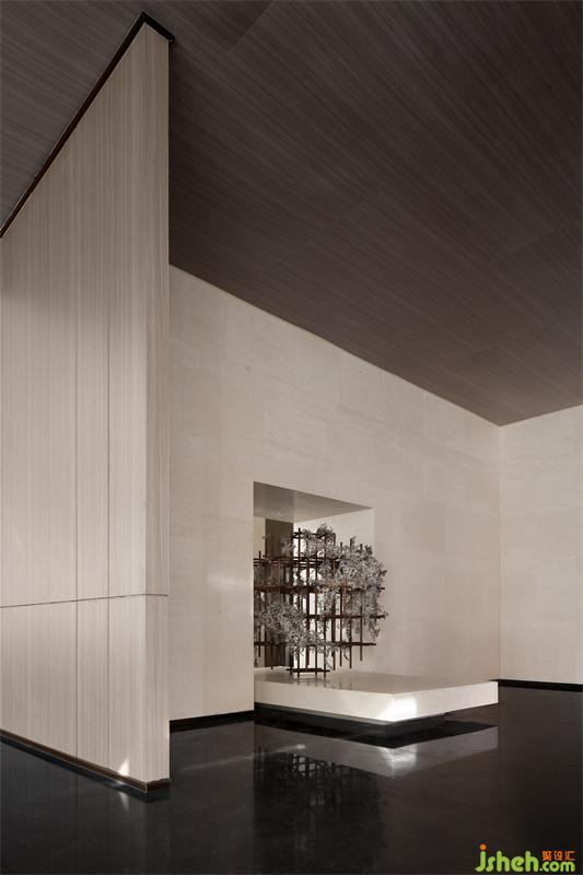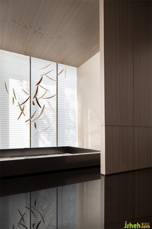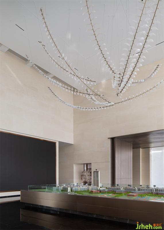 進(jìn)入前廳,在挑空的空間中衍生出楚風(fēng)遺韻,銷售中心設(shè)計(jì)帶有漢繡元素的藝術(shù)品以現(xiàn)代的材料和手法將其轉(zhuǎn)化,如一顆璀璨的明珠鑲嵌于中國斗拱結(jié)構(gòu)的框架內(nèi),只需要安靜仰望,便能感受到空間本身的精神——這個城市及在此生活的人的歷史變遷與分合。