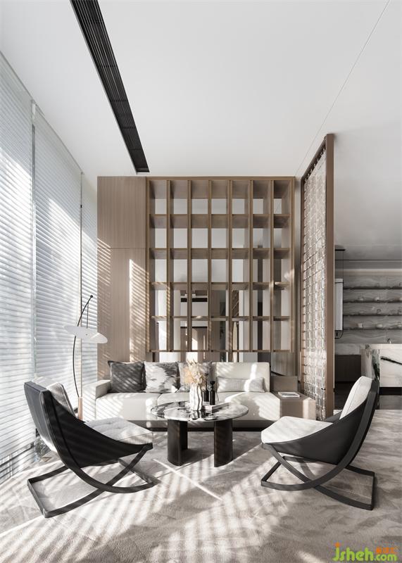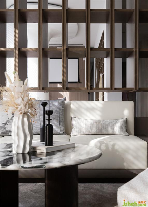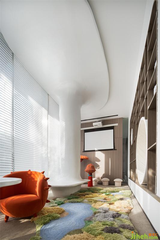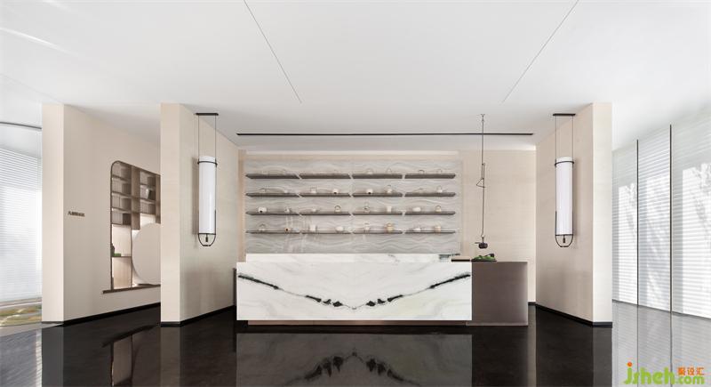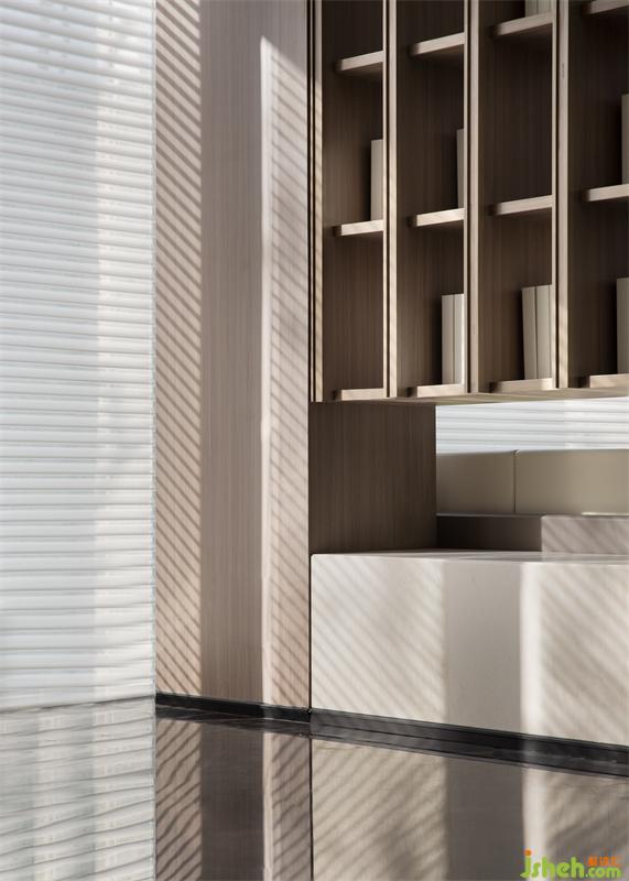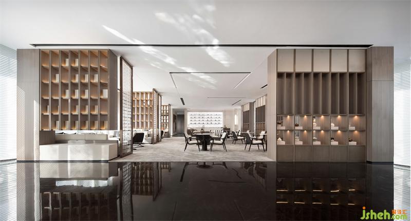 洽談區(qū)在開(kāi)放的空間中進(jìn)行了疏落有秩的布局,線(xiàn)性成面的簡(jiǎn)易書(shū)架,將空間巧妙分割,如同置身于千年前的蘭臺(tái)書(shū)院之中,在若隱若現(xiàn)間,構(gòu)建時(shí)光的趣味與詩(shī)意。