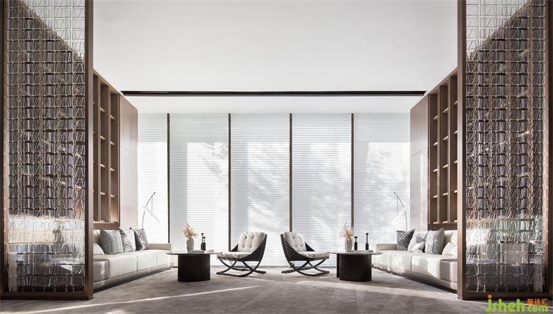 同一空間中,銷(xiāo)售中心設(shè)計(jì)面料、木藝、金屬及石材等不同材料之間的碰撞,簡(jiǎn)明而克制。