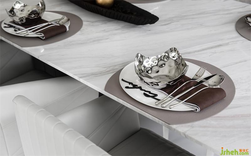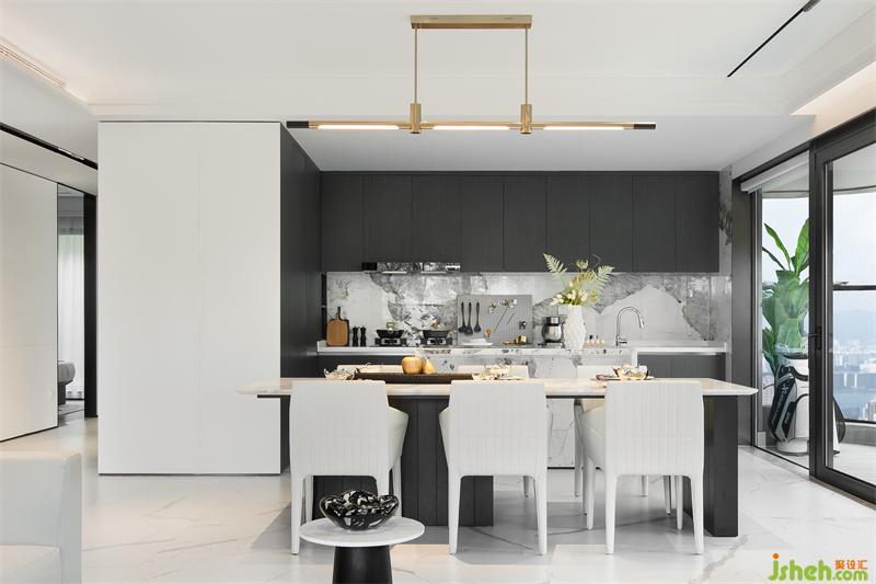 餐廳空間刪繁就簡(jiǎn),考慮空間設(shè)計(jì)的本質(zhì),將水吧與餐桌相結(jié)合,在現(xiàn)代風(fēng)格的皮質(zhì)餐椅下,展出著自由藝術(shù)的美感。