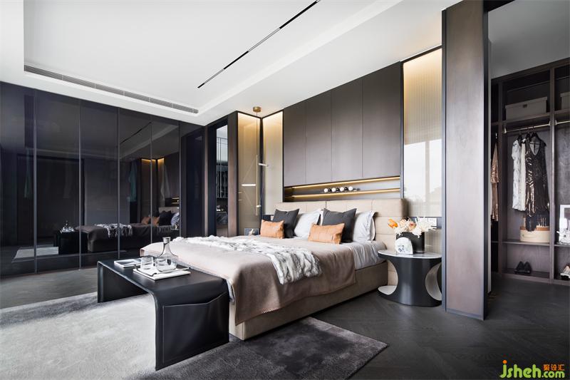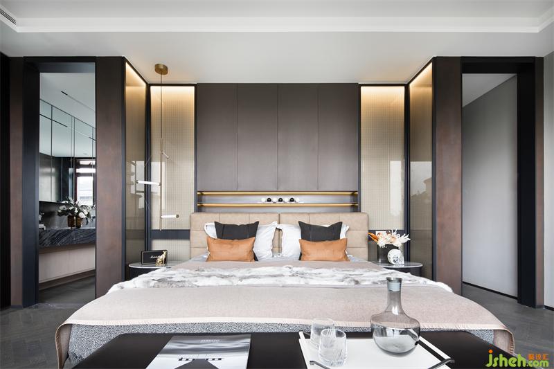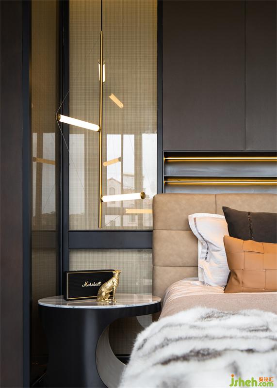 主臥從簡約、低奢優(yōu)雅的空間感受出發(fā),延續(xù)整體低飽和度色彩特點,樣板間設計并巧妙引入橙色進行整體空間提亮,在金屬與燈光的加持下,仿佛在沉靜中醞釀蓬勃的活力,讓平和優(yōu)雅的心境在此處生根發(fā)芽。
