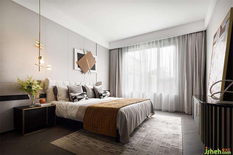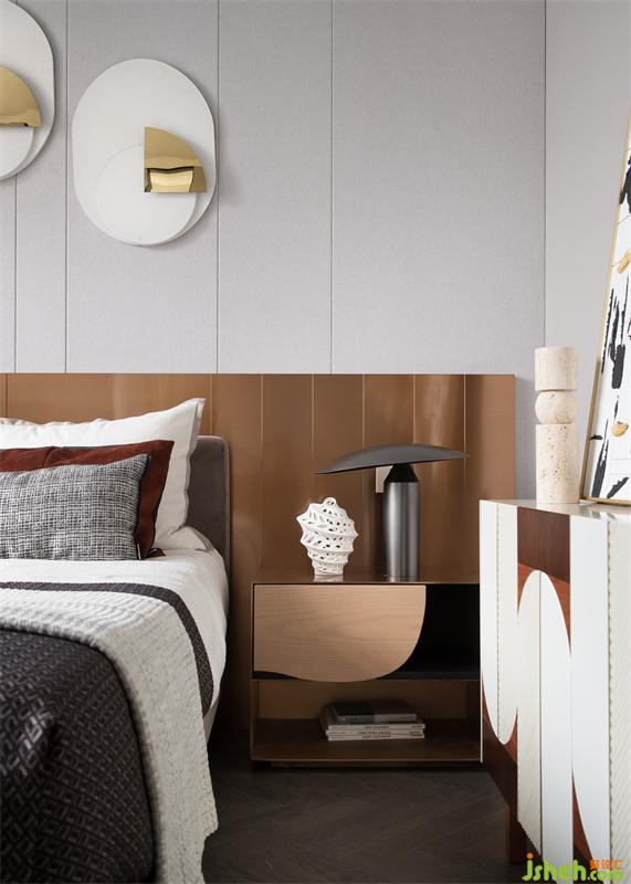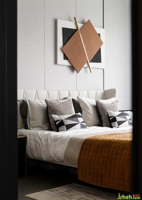 樣板間設計極具腔調的橙色床頭背景、舒適溫暖的布藝床品及幾何裝飾,碰撞出藝術的通感,形體碰撞,線條交錯,渲染出生活的多面可能。
