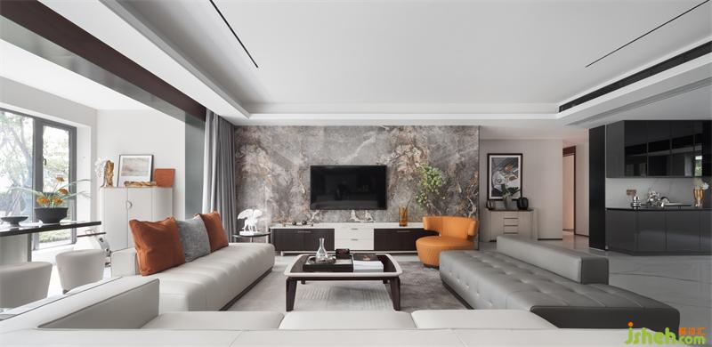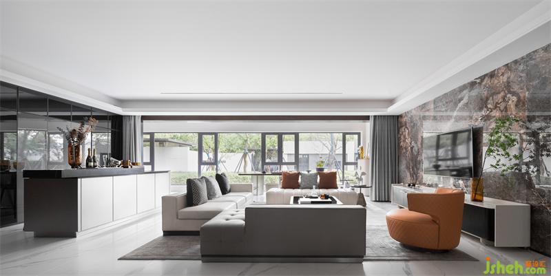 靈活的U型沙發(fā)將空間分割出不同的生活場景,點(diǎn)綴愛馬仕橙的單人皮椅,平衡了冷與暖的視覺感受,藝術(shù)擺件與植物的光影映照,流露出現(xiàn)代美學(xué)光澤,在日出黃昏中,不動聲色的捕捉生活中的美好與希冀。