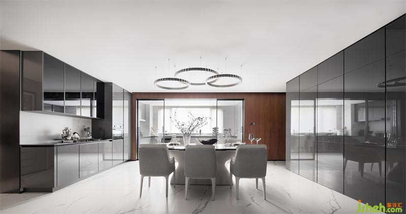客廳在淺色調(diào)的鋪敘下,由內(nèi)向性的空間美學(xué)轉(zhuǎn)向一種開敞的非封閉狀態(tài),涵蓋了接人待客與居家共享的重要空間,整面落地窗削減了空間線條的硬朗,最大程度吸納室外舒朗景致,讓都市性格和自然情緒于此處有機(jī)結(jié)合。光影之下,流暢緊湊的生活動線被巧妙引出,沒有過多贅述,一氣呵成。