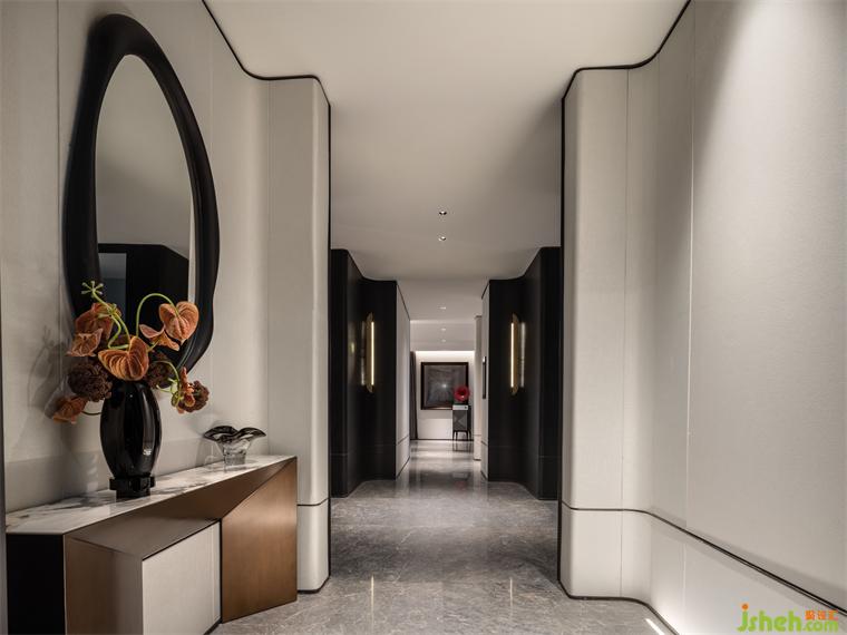 城居無界,入戶玄關(guān)優(yōu)雅柔長(zhǎng),流暢開放的空間曲調(diào)在場(chǎng)景中延展。樣板間設(shè)計(jì)大體量的木飾面與壁布?jí)w曲線流暢串聯(lián),借由藝術(shù)品、家具和裝飾物和諧共生,在張馳之間,感受著生活的律動(dòng)。