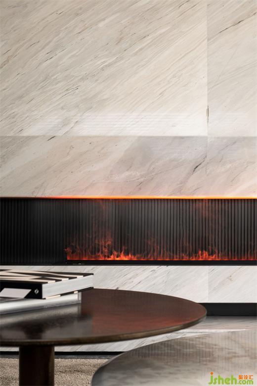 整面石材電視墻、流線型的沙發(fā)座椅以及金屬石材茶幾,樣板間設(shè)計(jì)圍合出舒適通透的交流場(chǎng)域,看似沖突的材質(zhì)在形態(tài)的圍合中微妙相洽,形成空間的層次。