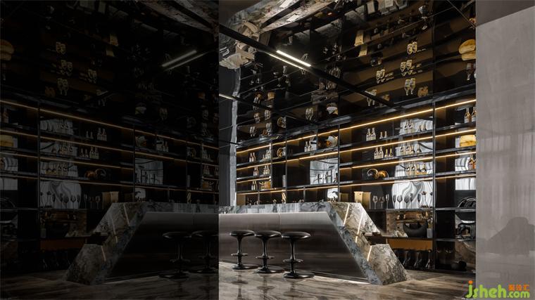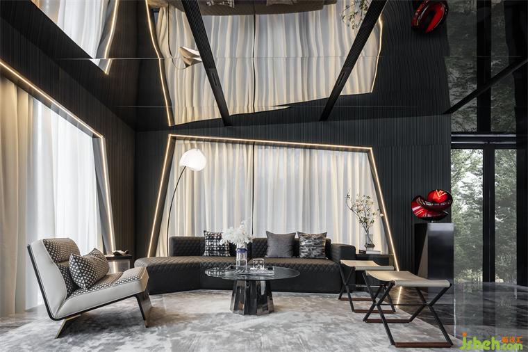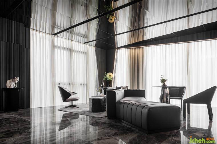 延續(xù)宇宙的神秘,洽談區(qū)空間以大量鏡面材料為背景,頂面采用灰鏡斜面設(shè)計(jì),實(shí)現(xiàn)縱深感。不規(guī)則異形窗框的使用,渲染出充滿生機(jī)的空間力量。在精準(zhǔn)的比例中,用嚴(yán)謹(jǐn)?shù)膸缀沃刃騺順?gòu)建感性的場域,生活的姿態(tài)與宇宙的無盡在這一刻得以共鳴。