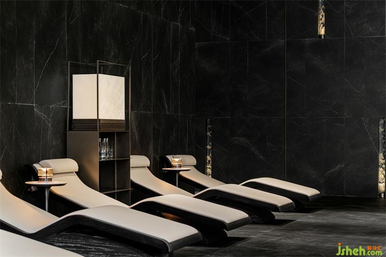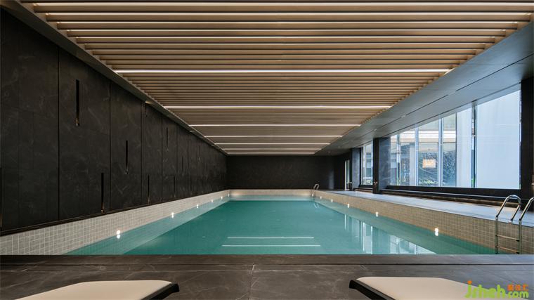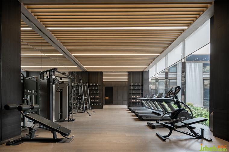 泳池圍繞景觀中庭展開,墻面和地面材料統(tǒng)一使用深色仿石材巖板,墻面星光點(diǎn)綴。營銷中心設(shè)計健身房利用落地玻璃,擴(kuò)大自然流動的空間屬性與自然產(chǎn)生對話,陽光透過玻璃照射進(jìn)來,運(yùn)動的疲憊在這一刻得到撫慰。運(yùn)動空間的設(shè)計,創(chuàng)造出一個自在交流、健康運(yùn)動的社交場域,為居住者構(gòu)筑一處志趣相投的圈層領(lǐng)地。