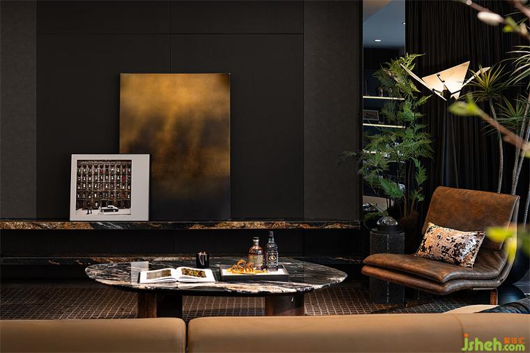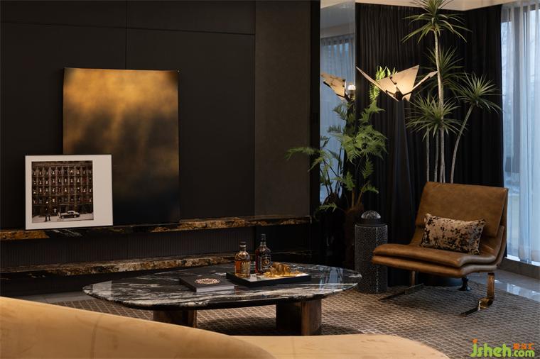 客餐廳選用橫廳一體化設計,避免傳統(tǒng)功能割裂的布局,打造出空間更多的可能性?;⌒握嫫ど嘲l(fā)配以深灰地毯,色彩對撞中形成豐富的材質質感。墻體由富有肌理感的深色皮革鑲貼,與一側輕盈飄逸的紗幔形成了鮮明的虛實對比。變化的光影浮現(xiàn)于結構與材質交錯處,于每一寸空間中,盡享精致生活態(tài)度。