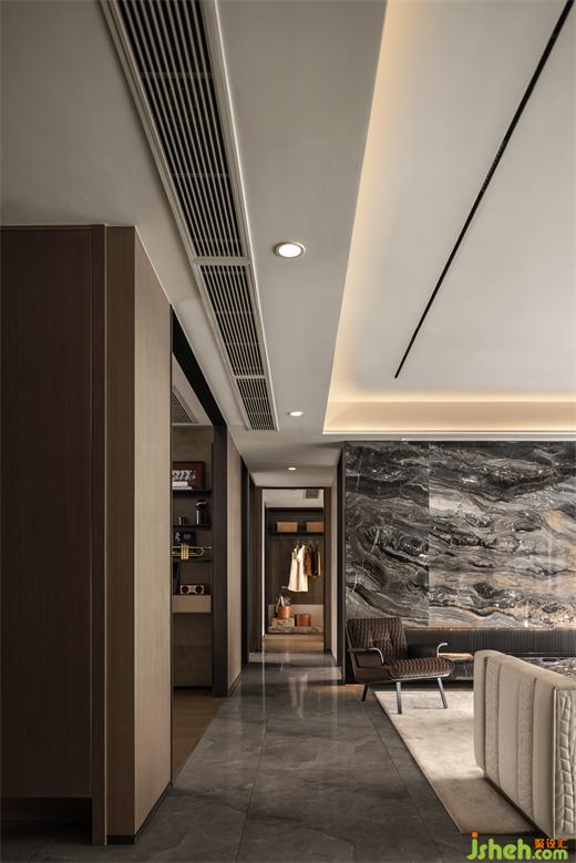 延續(xù)空間簡潔而利落的線條,主臥以低飽和度的灰主導(dǎo)空間配色,柔軟的織物與木質(zhì)的溫潤,恰到好處地突顯了空間的尺度,讓人在走進的一瞬便沉浸于漫卷云舒的松弛之中。