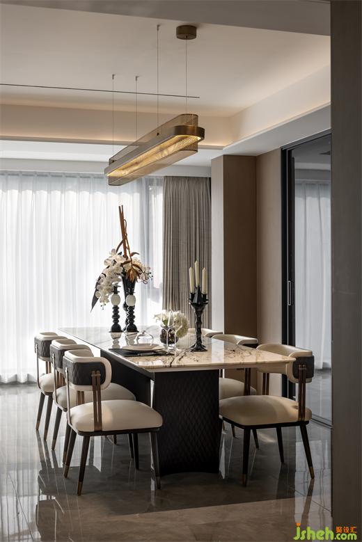 餐廳將剩余客廳空間有效整合,串聯(lián)起場域與生活。在開放聯(lián)動的布局中,各顯其美。餐桌的杯盞奏響一日三餐的樂章,在柴米油鹽的熏染中,于此處感受著升騰的人間煙火。