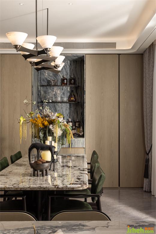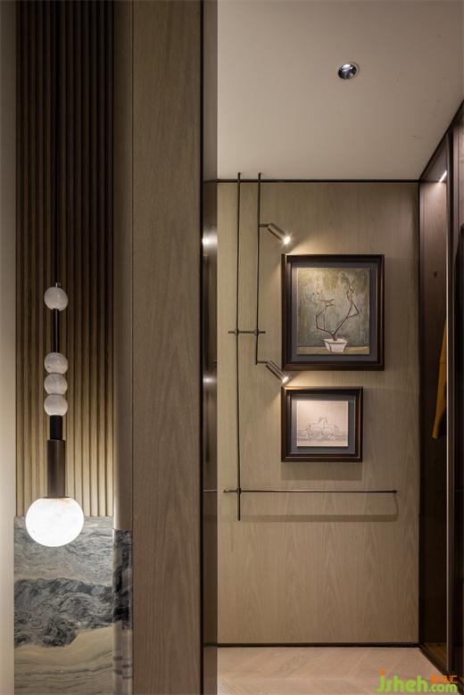 藝術(shù)過廳以一盞藝術(shù)吊燈,強(qiáng)化空間關(guān)系,在暖褐色的基調(diào)下,奢的肌理與雅的氣質(zhì),不浮于表面,刻寫在空間場景的生動細(xì)節(jié)之中。
