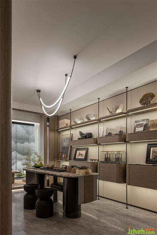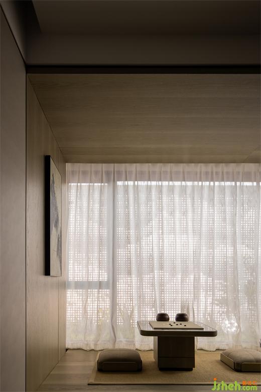在開放性空間之下,書房與客餐廳的毗鄰讓空間更具互動性,增強(qiáng)了居住與社交融會貫通的物理屬性。一側(cè)的榻榻米區(qū),增加了空間的文雅氣息,執(zhí)一指黑白棋,下一局人生。