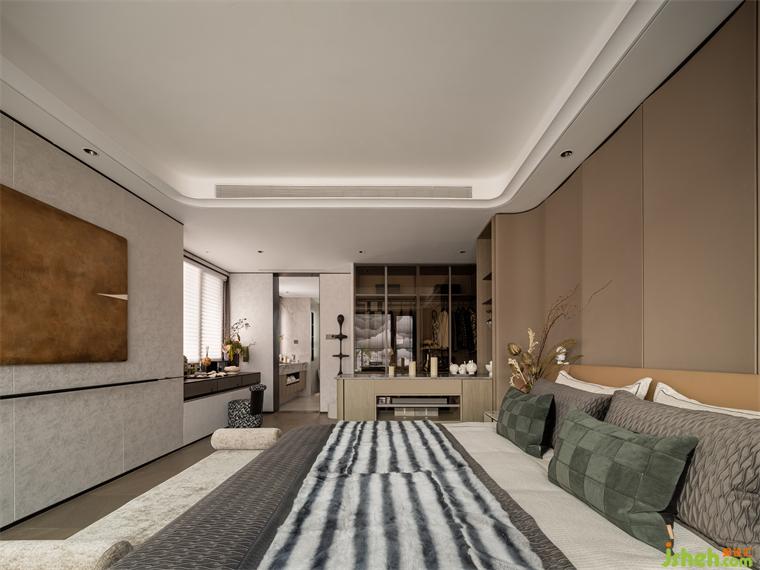移步主臥,仿佛進(jìn)入了一隅獨(dú)立天地。整個樣板房設(shè)計(jì)蘊(yùn)藏著詩意優(yōu)雅與現(xiàn)代簡約的融合,天花的弧角溫潤親和,背景墻的編織皮革如同時間的肌理,在觸手可及的溫潤質(zhì)感下,撫平都市人的煩擾。