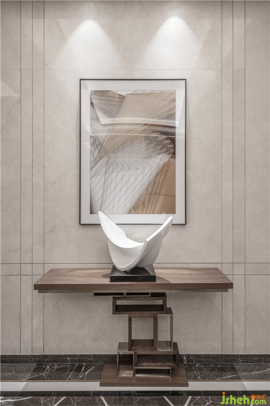 背景墻、屏風(fēng)、藝術(shù)品形成了層次分明、主次清晰的布局,由抽象至具體,由自然至人工,情緒在無(wú)聲間逐漸遞進(jìn),空間氛圍在設(shè)計(jì)師的精巧設(shè)置下進(jìn)一步升華。