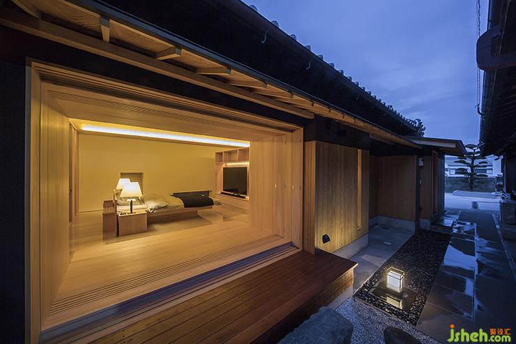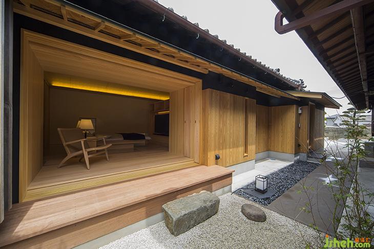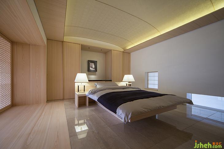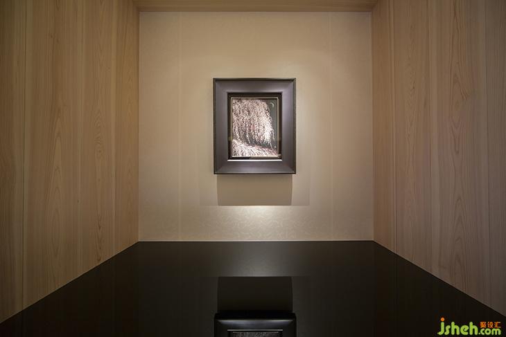 設計借助了自然界中四季的概念。而畫代表著春天。夏天:由滑動門上的麻葉圖案象征。光線會柔和地透過有麻葉圖案的紙屏風進入房間。秋天:由漆板上的楓葉象征。冬天:由編入松針圖案的置于天花板的綢物象征。櫻花能耐嚴寒一直到它們開花。冬天是補充這幅畫一個必不可少的元素。側門上流動的圖案代表水,暗示著后面的浴室設施。日本扁柏用于家具和室內裝飾,意大利大理石用作地板材,風格上是現代與傳統(tǒng)的混合。