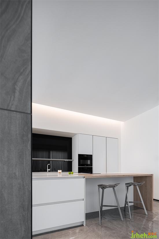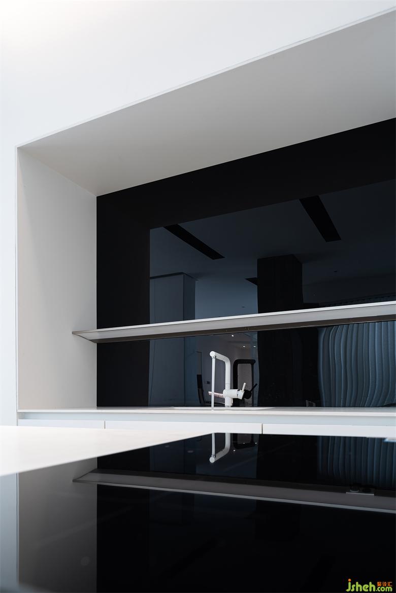 西廚與島臺間做了縱向聯(lián)通,色調(diào)上統(tǒng)一為了白色黑色,大氣時尚 。