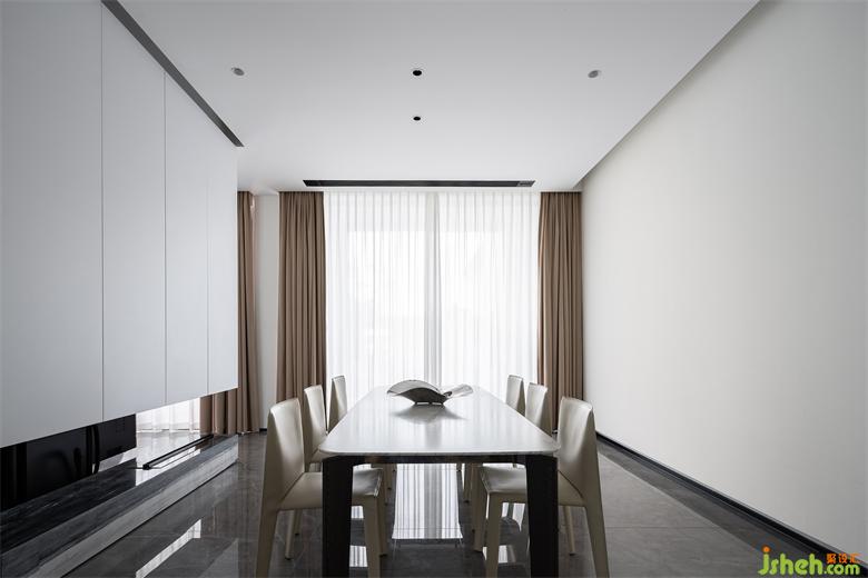 空間格局上我們把就餐區(qū)域與客廳會客區(qū)進(jìn)行分離,半鏤空的隔斷吊柜既能有效保證功能區(qū)分,又可以滿足餐廳的收納需求。