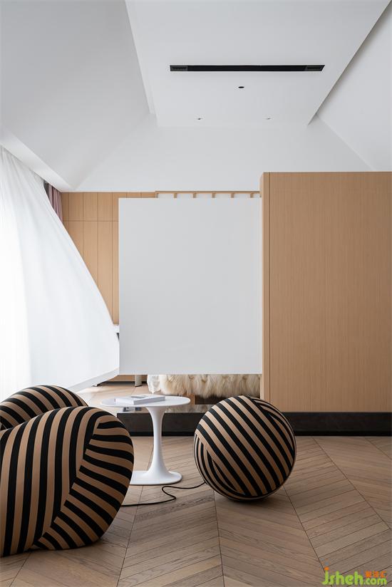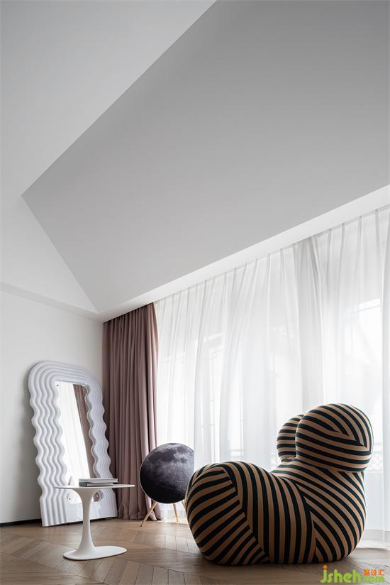 書房與床之間做了低矮的隔斷,別墅設計功能上略做區(qū)分,視覺上也保障了睡眠的隱私感。