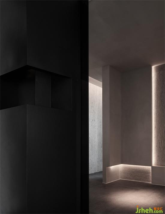 隱藏的光源烘托出材質(zhì)本身的質(zhì)感,光、影結(jié)構(gòu)本身的變化以及材質(zhì)的不同碰撞在這一玄關(guān)區(qū)域猶如巴赫的音符一樣層次分明層層堆疊 。