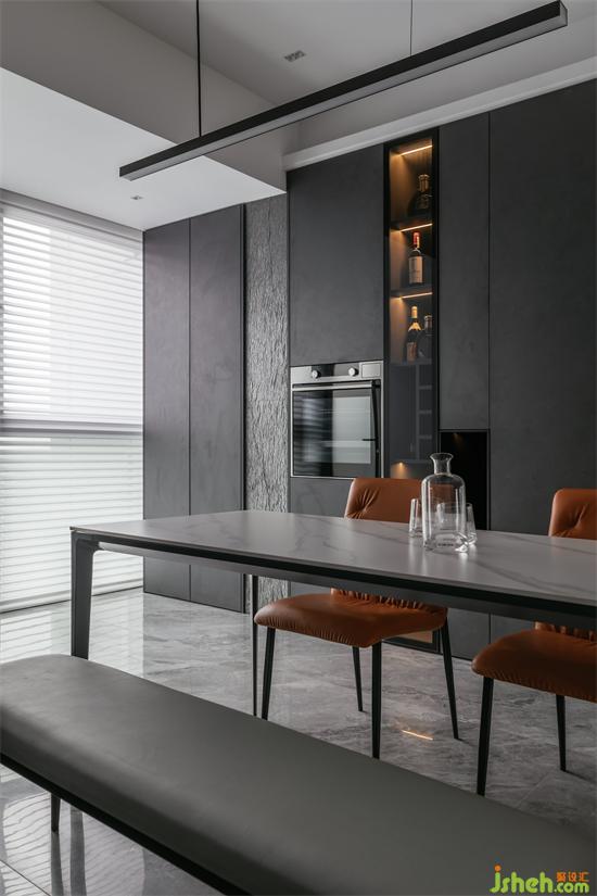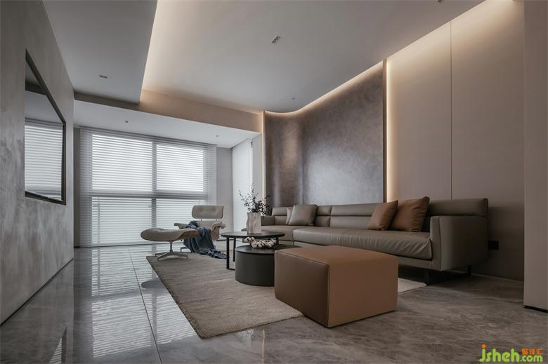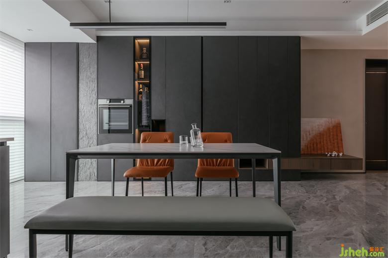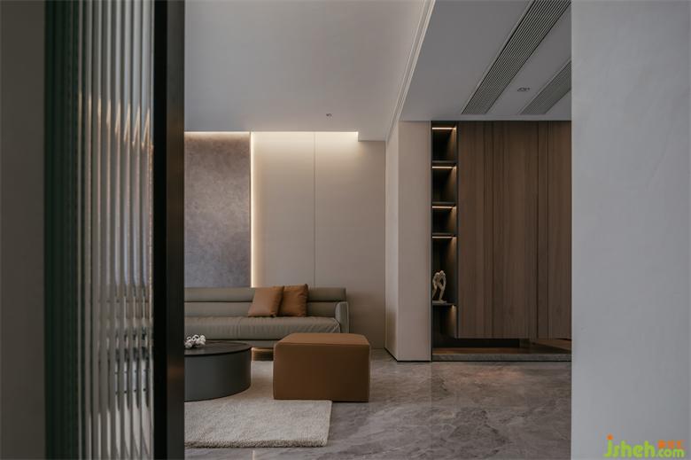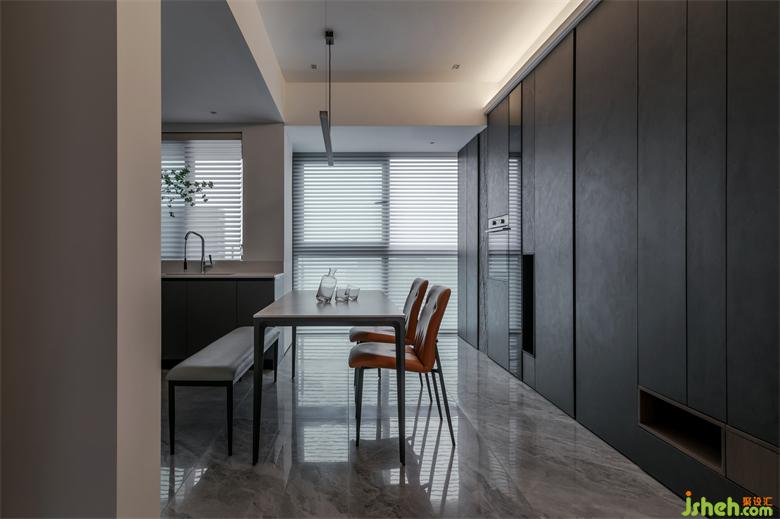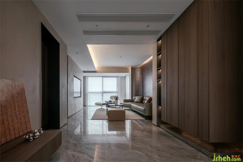 Calmness is the design fundamental key of the space, from the dark of kitchen area to the wood color of corridor to the coffee color of the living room, just have soft, texture is full.